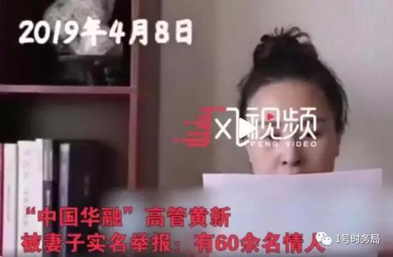 網上流傳的一段視頻當中,舉報人名為萬莉莉,自稱中國華融發展研究部高級經理黃新的妻子。她表示,她丈夫黃新涉嫌違反政治紀律和政治規矩貪污受賄,擁有情人60多名,