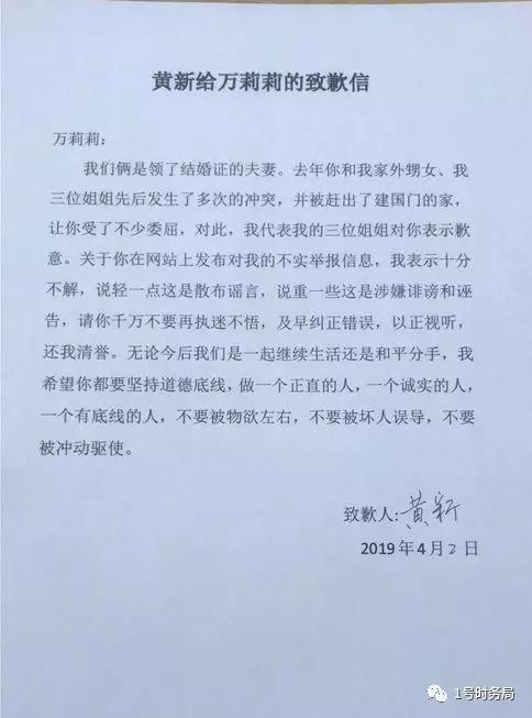 值得一提的是,網上同時還流傳著一封萬莉莉致黃新的道歉信,但對這封所謂的“致歉信”,萬莉莉指出,該致歉信為黃新單方面偽造,并不是出自她的手。